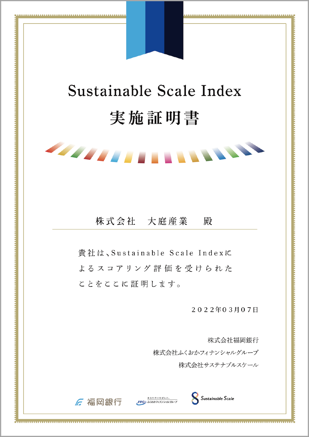 企業の相対的なSDGs/ESGに関連する取り組みを「SDGsの17ゴール」と「ESGの10カテゴリー」に沿って指標化するSDGs/ESGスコアリングサービス「Sustainable Scale Index」の実施証明書をいただいております。