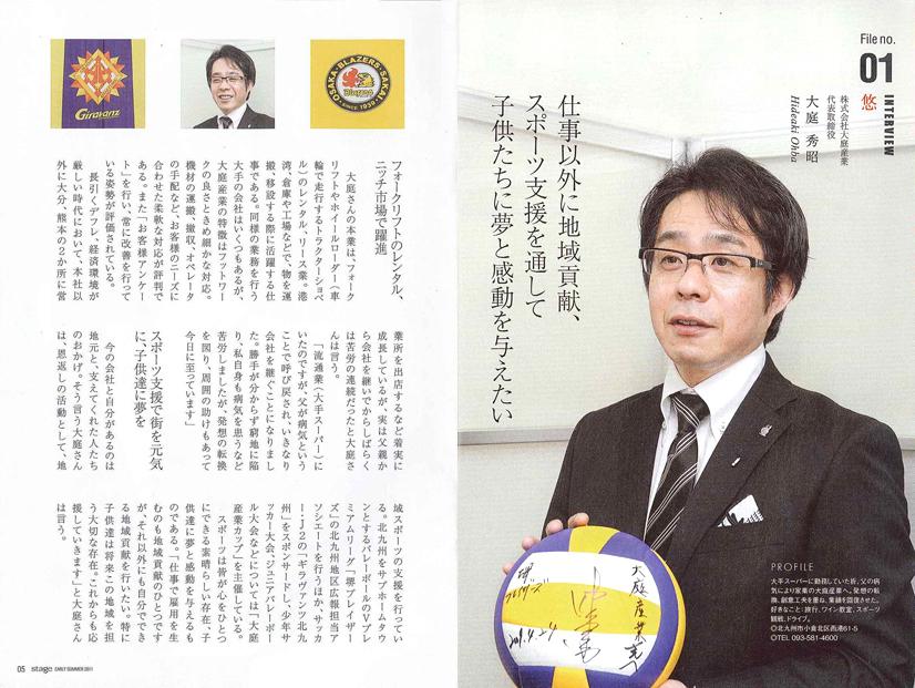 北九州のライフスタイル情報誌「stage」に弊社代表取締役 大庭秀昭のフォークリフトのレンタル業発展やスポーツ支援による地域貢献に関する記事が掲載されました。