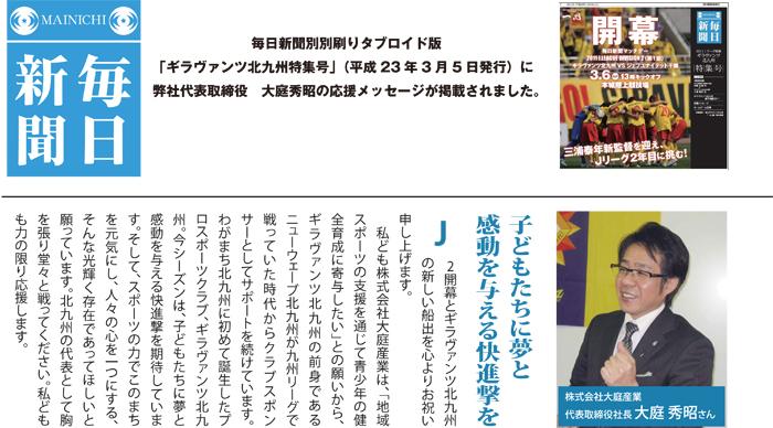 毎日新聞別刷りタブロイド版「ギラヴァンツ北九州特集号」(平成23年3月5日発行)に弊社代表取締役 大庭秀昭の応援メッセージが掲載されました。